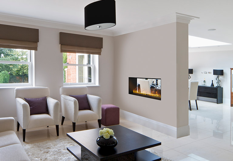 Picture the perfect fireplace: any length, any location, and any number of sides. Forget about venting, gas lines, and hot glass. They are a thing of the past. Now imagine flames made of water that you can reach out and touch. The revolutionary Opti-Myst® by Dimplex reinvents the electric fireplace and makes it easier than ever to add a dramatic fire feature to any space. Because of the see-through, three-sided, open concept, the possibilities are endless. Talk about a conversation starter!